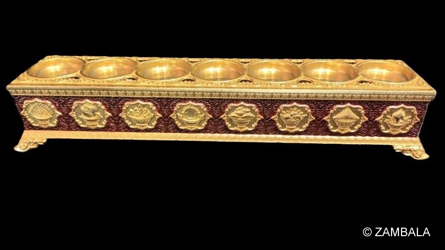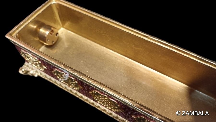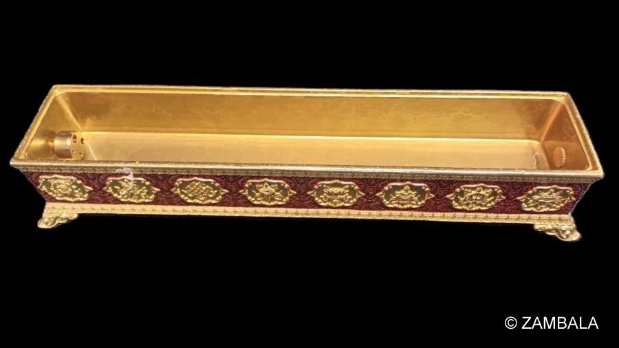 | Material: Gold-plated dual-purpose candle holder + incense burner (two-piece)Size: 30 x 6 cm approx.Narrative:The incense burner of Tibetan Buddhism is not only an important instrument for worshiping Buddhist teachings, but also carries profound cultural and religious significance. Different from the standing incense commonly seen in Chinese Buddhism, Tibetan Buddhism mostly uses **lying incense**, which is to place agarwood or incense sticks horizontally in the incense burner and burn them to achieve the effect of purifying the mind and worshiping Buddha. **Story and symbolism of the incense burner**Incense burners symbolize purity, offerings and blessings in Tibetan Buddhism. Its shapes are varied, and common materials include copper, ceramics and wood products. Among them, copper incense burners are particularly popular because they are stable, durable and solemn. Many Tibetan incense burners are engraved with the **Eight Auspicious Treasures** or the **Six-Character Mantra** (Om Mani Padme Hum) to enhance the merit of the offering. In Tibetan Buddhist practice rituals, burning incense is seen as a way to convey offerings and prayers to the Buddhas and Bodhisattvas. The rising smoke symbolizes the wishes and prayers of the practitioner being carried to a higher spiritual realm. In addition, incense burners are also closely related to the **smoke offering** ceremony, which is a way of practicing to purify the environment, eliminate karma and benefit all living beings by burning offerings. This incense burner can also be used as a lamp (candle holder). |  |