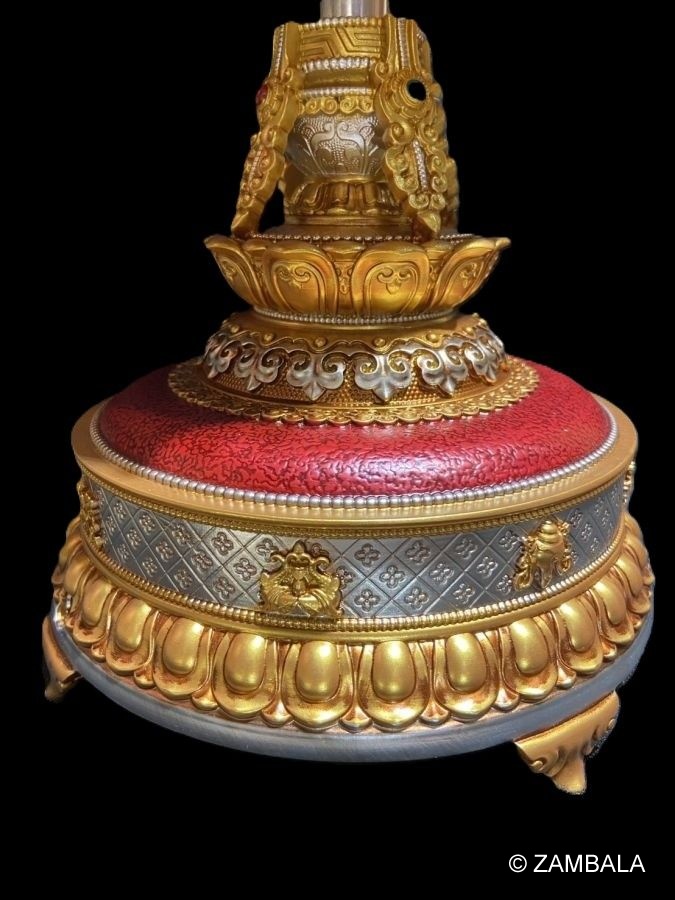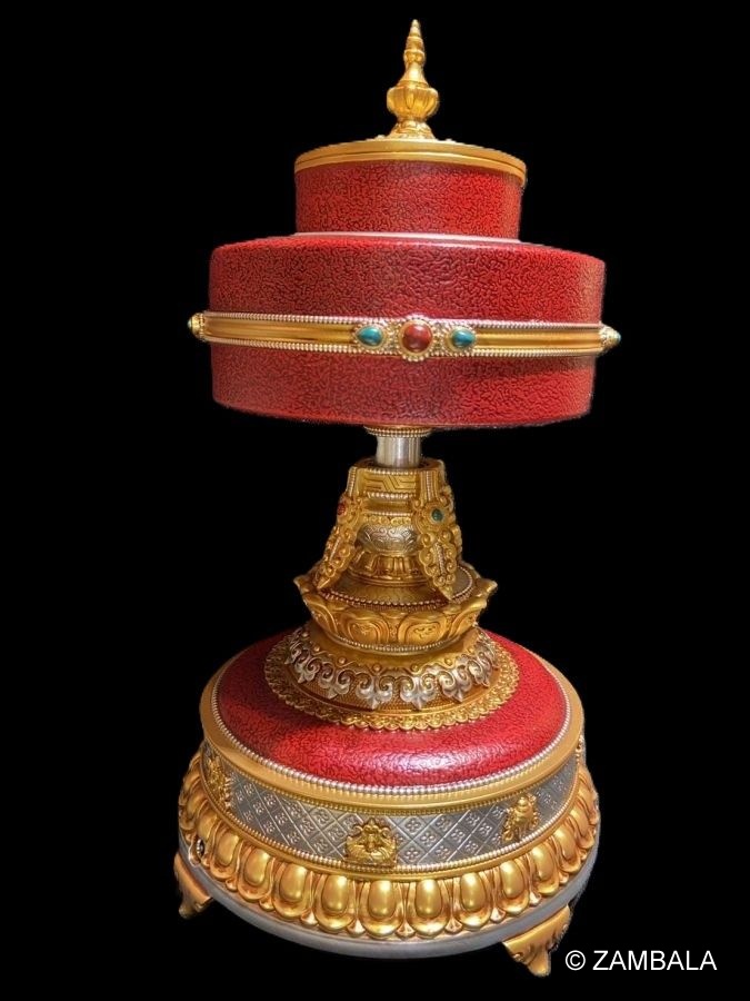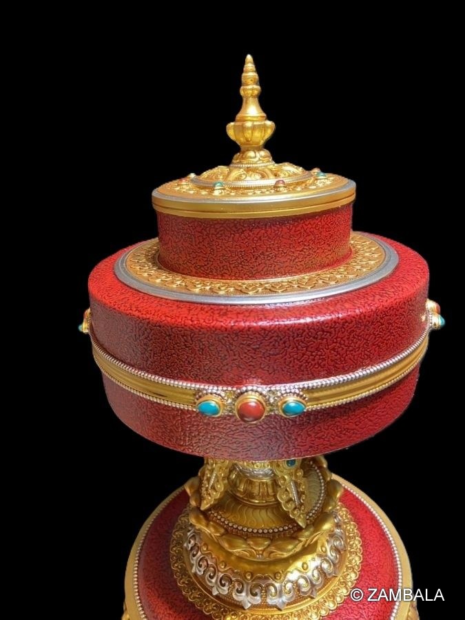 | Material: Plastic. Painted. Plug-in. Six-syllable Mantra ScriptureSize: 38cm (Medium)Description:The prayer wheel (Tibetan: མ་ནི་ཆོས་འཁོར་, Mani Chokhor, meaning "wheel of Dharma" or "prayer wheel") is one of the important instruments in Tibetan Buddhism and is widely used in Tibetan Buddhist practice, rituals and daily life. It is not only a material tool, but also carries profound religious philosophy and symbolic meaning. The following will discuss in detail the origin, symbolic meaning and use of the prayer wheel in Tibetan Buddhism. 1. The origin of the prayer wheel 1. **Historical and cultural roots**The origin of the prayer wheel can be traced back to Indian Buddhism, especially the development period of Vajrayana (about 7th-8th century). Its concept is related to the Buddhist "Dharma Wheel", which symbolizes the rotation of the Buddha's teachings (Dharma) and spreads wisdom and compassion. With the introduction of Buddhism to Tibet (around the 7th century, during the reign of Songtsen Gampo), the physical form of the prayer wheel gradually developed in Tibet and merged with the local Tibetan culture, becoming a unique symbol of Tibetan Buddhism. Scholars generally believe that the specific form of the prayer wheel may have been influenced by Hinduism and Bon (the original religion of Tibet). For example, certain rotating objects and prayer rituals in Bon may have inspired the design of the prayer wheel. In addition, the popularity of the prayer wheel is closely related to the mantra tradition of Tibetan Buddhism, especially the spread of the six-syllable mantra (Om Mani Padme Hum). 2. **Legend and Guru Padmasambhava**In the Nyingma tradition of Tibetan Buddhism, the promotion of the prayer wheel is often attributed to Guru Padmasambhava (8th century), who is believed to have brought the Tantric teachings to Tibet. According to legend, Guru Padmasambhava taught the use of prayer wheels, believing that their rotation can amplify the merits of mantras, purify karma and accumulate merit. Another theory is that the design of the prayer wheel was inspired by Nāgārjuna (c. 2nd century), who wrote mantras on paper and placed them in a rotating wheel to symbolize the constant rotation of the Dharma Wheel. 3. **Manufacturing and Forms**Prayer wheels are usually cylindrical and made of wood, metal or bone, with rolled-up scriptures or mantras (mainly the six-syllable mantra) inside. The outer shell is often engraved with mantras or auspicious patterns (such as the eight auspicious symbols). Prayer wheels come in the following forms:- **Handheld prayer wheels**: portable, for personal use, held and rotated by believers.- **Fixed prayer wheels**: installed at the entrance of temples, pagodas or villages, for multiple people to rotate.- **Hydraulic or wind-powered prayer wheels**: driven by natural forces (such as water flow or wind), symbolizing the uninterrupted rotation of the Dharma Wheel.- **Large prayer wheels**: Commonly seen in temples, they contain millions to hundreds of millions of mantras, and rotating them once is equivalent to reciting all the scriptures. 2. Symbolic meaning of prayer wheels 1. **The Dharma Wheel is Always Turning**The core symbol of the prayer wheel is "the Dharma Wheel is Always Turning", which represents the sustainable spread of the Buddha's teachings. The Buddha's first turning of the Dharma Wheel (the four noble truths preached in Deer Park) is regarded as the beginning of Buddhism, and the rotation of the prayer wheel is believed to continue this process of dissemination, spreading the Dharma throughout the universe and purifying sentient beings and the environment. 2. **The power of mantras**Prayer wheels usually contain the six-syllable mantra or other mantras, and when they are rotated, they are considered to be equivalent to reciting these mantras repeatedly. The six-syllable mantra is related to the compassion of Avalokiteśvara (Tibetan: Chenrezig), and rotating the prayer wheel is seen as arousing Avalokiteśvara's blessings, helping sentient beings eliminate suffering, accumulate merit and move towards enlightenment. 3. **Purification and Merit**The rotation of the prayer wheel is believed to purify karma (negative karma), including bad karma of body, speech, and mind. Tibetan Buddhism believes that rotating a prayer wheel once is equivalent to reciting all the scriptures contained in it, which is of great merit. In addition, the rotation of the prayer wheel can spread blessings to the surrounding environment, benefiting all living beings and non-human beings (such as animals, ghosts and gods). 4. **Harmony of the Universe**The circular shape and rotating movement of the prayer wheel symbolize the cycle and harmony of the universe, echoing the Tibetan Buddhist philosophy of "dependent origination and emptiness". The rotation process is seen as integrating personal practice into the cosmic order and promoting harmony between the inside and the outside. 5. **Combination of Compassion and Wisdom**The prayer wheel is often associated with the compassion of Avalokitesvara, and rotating it is an act of compassion that aims to benefit all living beings. At the same time, the scriptures and mantras contained in it represent wisdom, and the rotation process symbolizes the unity of compassion and wisdom, which is the core concept of Tibetan Buddhist Tantric practice. 3. How to use the prayer wheel 1. **Personal practice**- **Hand-held prayer wheel**: Believers hold a small prayer wheel and rotate it clockwise (symbolizing compliance with the order of the universe) while silently chanting the six-syllable mantra or other mantras. This method is common in pilgrimages, retreats or daily practice, helping practitioners to focus and accumulate merit.- **Meditation aid**: The rhythmic rotation of the prayer wheel helps to regulate breathing and mood and enter a state of meditation. Practitioners often use prayer wheels 
